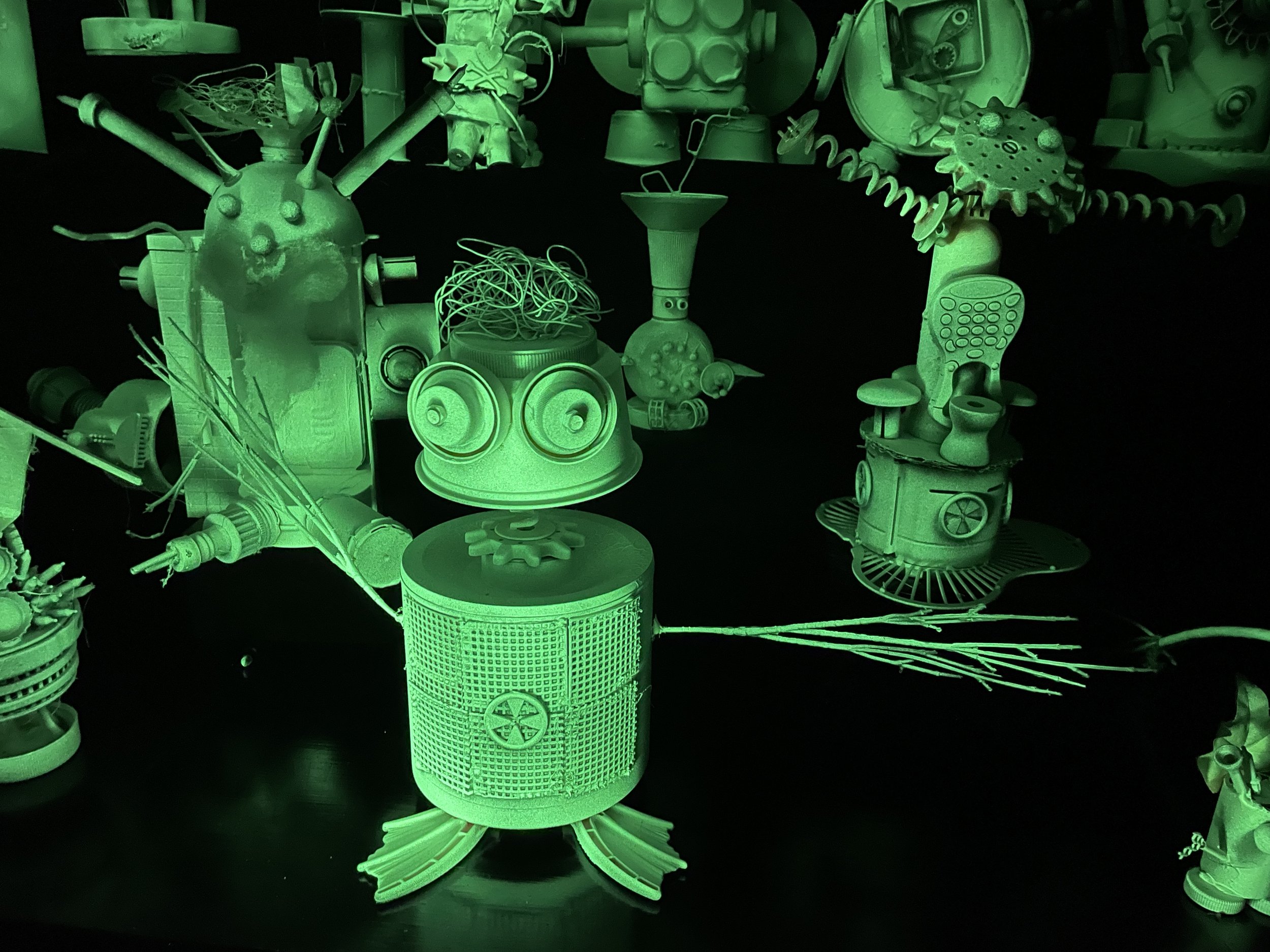 More than 70 Glowbots were created during two weekends of ‘open gluing’ at the Miniatures & Curious Collections Museum. With wonderful donated recyclables, toys, electronics, craft supplies and hot glue, makers of all ages turned “trash into treasures” or “bits into bots”. They were told not to get attached to the color of their creations as a layer of primer neutralized the cardboard and plastics, then layers and layers of glow-in-the-dark spray paint were applied. In order to get the bots to glow, light and darkness were needed! A section of the museum was covered in heavy black plastic sheeting which sounds extremely hot and stinky….so we had a fan and two air purifiers on at all times during the exhibit. To “charge” the glow, we set up black lights - lots of them - and allowed visitors to turn the lights on and off with a main power source. Luckily museum volunteer, Tinkerer/Thinkerer Bob, had a very high-powered blacklight on a swivel that REALLY helped the bots glow pretty fast. We also had a couple blacklight bulbs in clip lights that visitors could point to a particular bot they wanted to get “hot”. The green glow of 70+ robots, creatures, and ships was a sight to behold, but more kudos go to the creativity of the makers - the details, the ingenuity, and the character of the glowbots were outstanding!!! And we haven’t seen the last of some of them as a few were donated back to the museum to be used in the 2025 UFO Festival recyclable materials installation - so stay tuned!